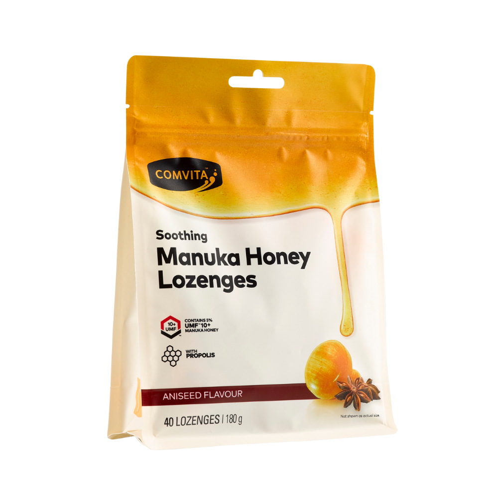 Comvita ™ Manuka Honey Lozenges combine the unique qualities of New Zealand UMF ™ 10+ Manuka honey and Propolis to provide a soothing taste anytime of day.
