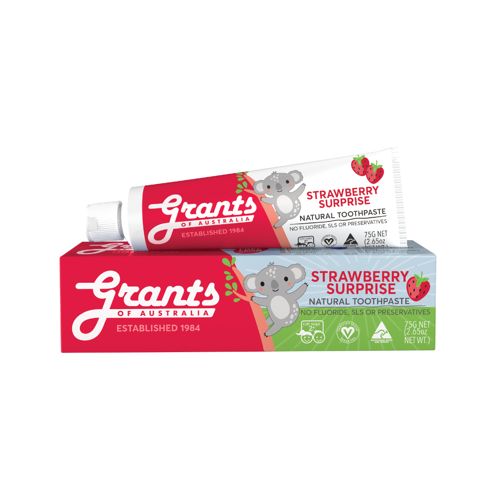 Kid tested and approved, Grants little taste testers have come back with the verdict: Grants Strawberry Surprise toothpaste is berry good! The extra Xylitol boost kills bacteria to minimise plaque and reduce tooth decay. Fluoride free and no added nasties like sugar, SLS and parabens, so parents will love it too!