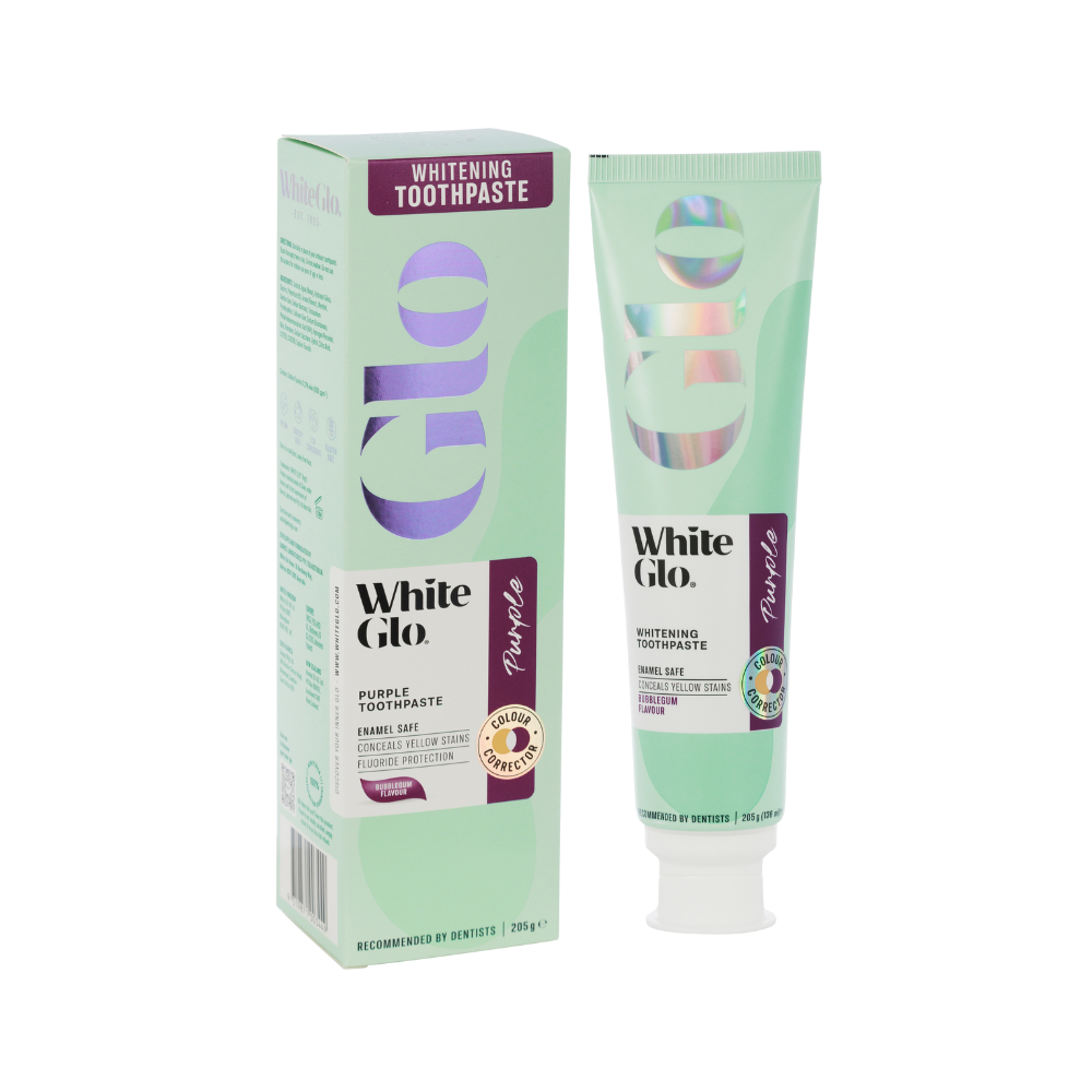 White Glo’s Purple Tooth Toner Technology features a specialised combination of red and blue dyes, to make purple colour correctors. These colour correctors instantly conceal yellow stains on teeth enamel. White Glo have developed this technology into a whitening toothpaste format, designed to be used daily.